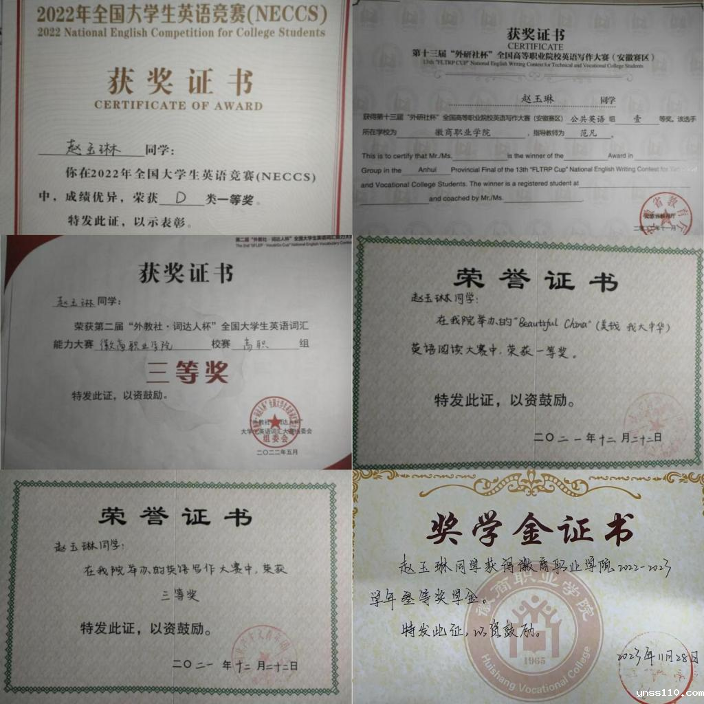 “博观而约取,厚积而薄发”。大学伊始,在辅导员老师的正确引领下,她便制定了科学的生涯规划和明确的学习目标,勤奋学习、刻苦钻研,时刻以高标准要求自己。在校园里,她友爱同学,尊敬师长,平日总是耐心给予周围的人力所能及的帮助。一分耕耘,一分收获,她还充分发挥自己的优势,积极参加各类英语竞赛,终于功夫不负苦心人,获得全国大学生英语竞赛D类一等奖和第十三届“外研社杯”全国高等职业院校英语写作大赛(安徽赛区)公共英语组一等奖两项省级一等奖,此外,她也顺利通过了英语CET-4等级考试。